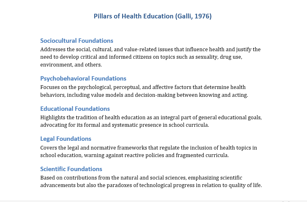 The fourth pillar in Galli’s (1976) model addresses the legal foundations, emphasizing that health education is a normative requirement in many national contexts. Laws, curriculum guidelines, public policies, and recommendations from international organizations often mandate the inclusion of topics such as disease prevention, sexual education, vaccination, mental health, and healthy eating in schools. These legal instruments serve as regulatory frameworks that grant legitimacy and obligation to health education practices, promoting their institutionalization.